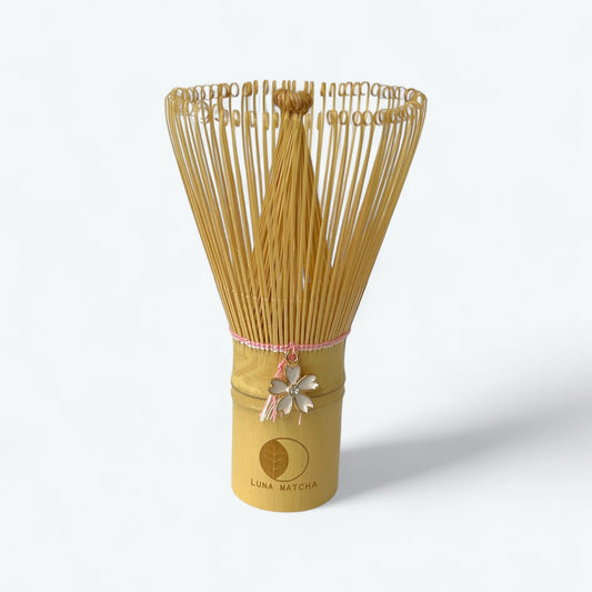 Bamboo Matcha Whisk with Pink String & Cherry Blossom (Sakura) Charm – 100 Prongs