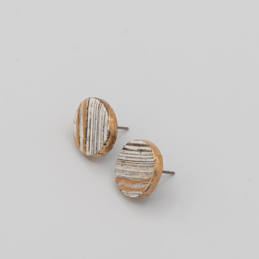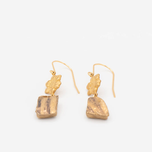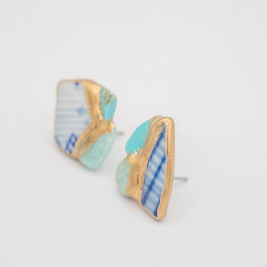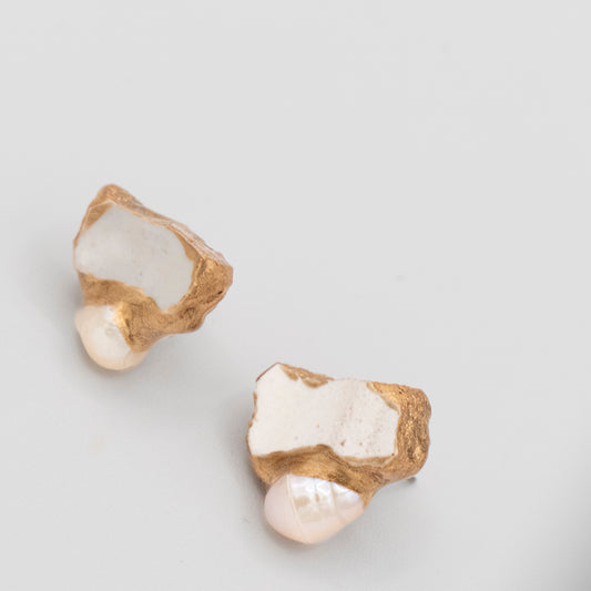 To achieve a beautiful, gold-hued finish reminiscent of this tradition, we carefully blend brass and pearl powder. Each crack and chip is lovingly highlighted with this golden-toned joinery, bringing you one-of-a-kind kintsugi rings, necklaces, earrings, and barrettes.