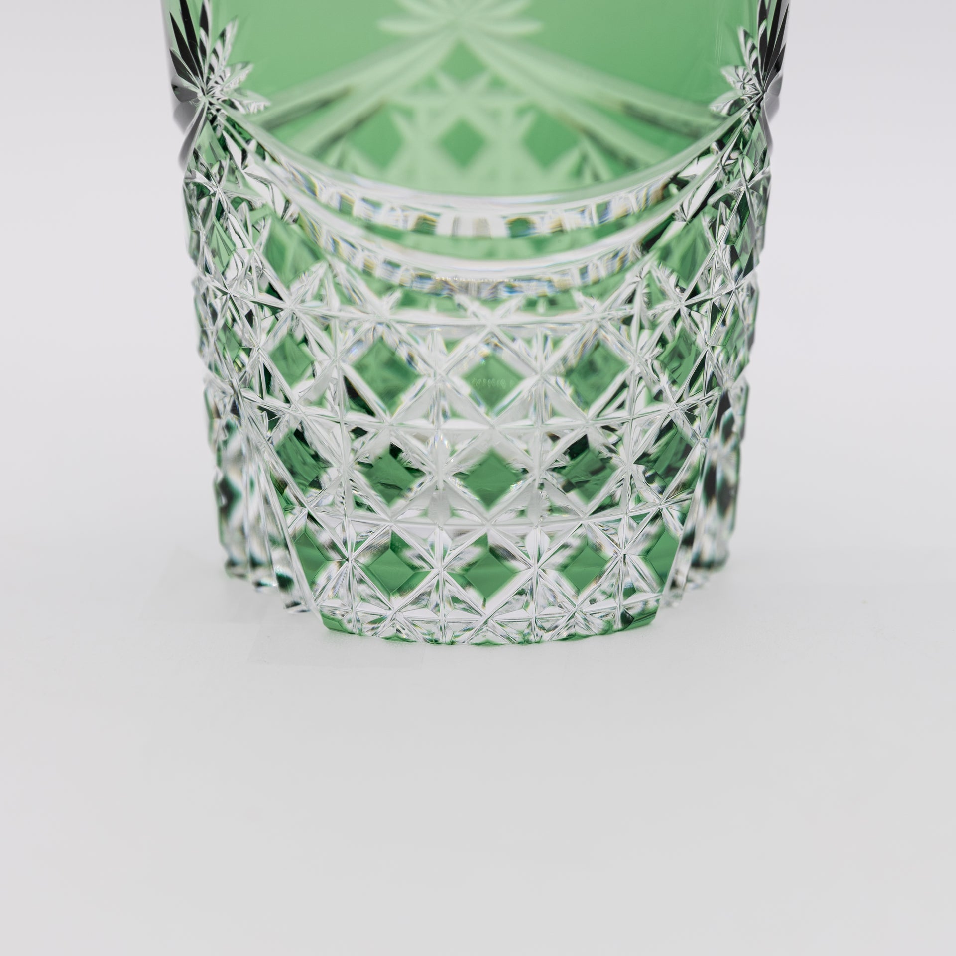 A Whiskey Glass of vivid green-tinted Crystal Glass rendered Edo Kiriko. This beautiful product is a new design named "Drape & Tetragonal Basket Weave", where you can feel both Japan through Edo Kiriko patterns and the occidental through outstanding cut.